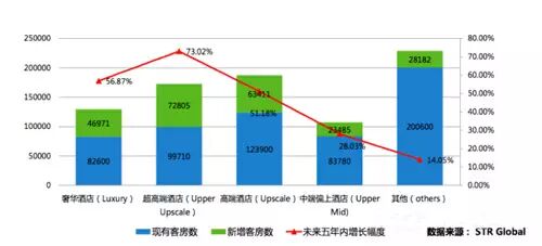 越高端的酒店增长率越大,高端和奢华酒店将以接近60%的增长速度增长。(弱弱的插一句,美国2013年豪华酒店的增长率是2%,欧洲是负数。)
