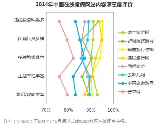 调研结果显示,2014年中国在线度假网站内容服务得分最高为阿里旅行·去啊,满意度达到93.1,其次为携程旅行网和途牛旅游网。从细分指标看,阿里旅行·去啊在“路线数量种类多”和“多种路线推荐”指标上有一定优势,途牛旅游网在游记/攻略丰富性方面满意度领先于其他度假网站。