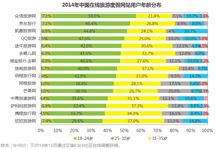 2014年中国各在线旅游度假网站用户以25-35岁居多,80后用户比例已超60%。