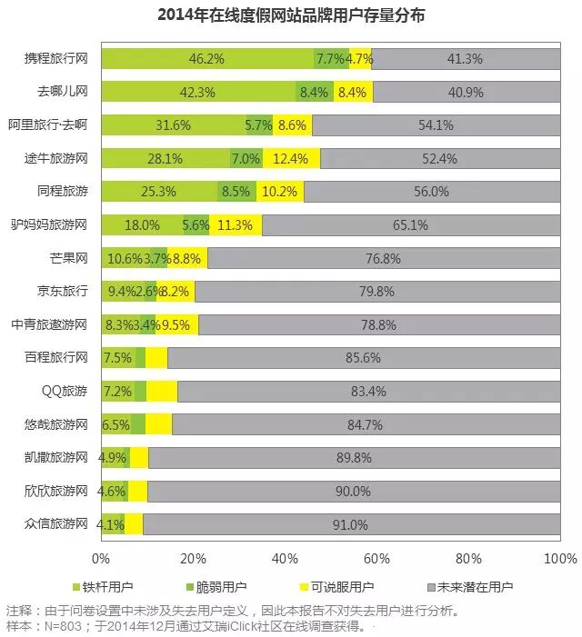 从用户存量来看,携程旅行网和去哪儿网铁杆用户均在40%以上,去啊和途牛旅游网铁杆用户相对占比也较高,分别有31.6%和28.1%,同时途牛旅游网拥有较多的可说服用户(占比12.4%)可引导使用。仍有多数在线度假网站未来潜在用户占比60%以上,可加强品牌推广继而吸引用户使用。