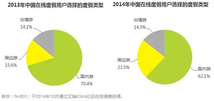 2014年中国在线旅游度假用户度假类型仍以国内游为主,周边游和出境游用户比例上涨。国内游收到周边游部分挤压,比例有一定下降。