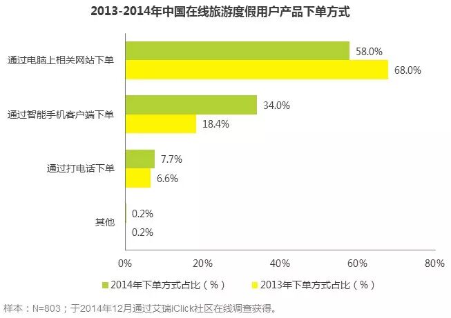 2014年中国在线旅游度假用户在线购买度假产品时,产品下单方式相比2013年用户产品下单方式有所变化:更多的用户开始由网站下单转向移动端下单。用户下单方式的转变,一定程度上反应出用户出行决策周期正在缩短,而用户对移动互联网使用习惯的初步形成以及在线旅游度假厂商向移动端的政策倾斜,将促使更多的用户通过手机客户端下单度假产品。