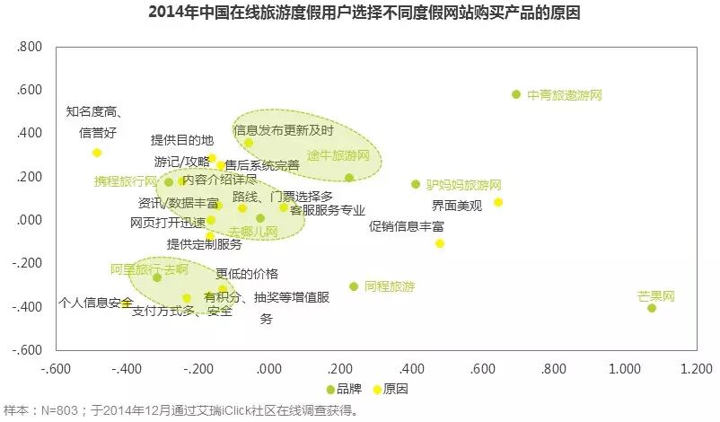 “更低价格”和“支付方式多、安全”为用户倾向选择阿里旅行主要原因;携程旅行网、去哪儿网“内容介绍详尽”、“路线、门票选择多”为用户看重原因;途牛旅游网“信息发布更新及时”更为吸引用户购买使用。